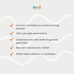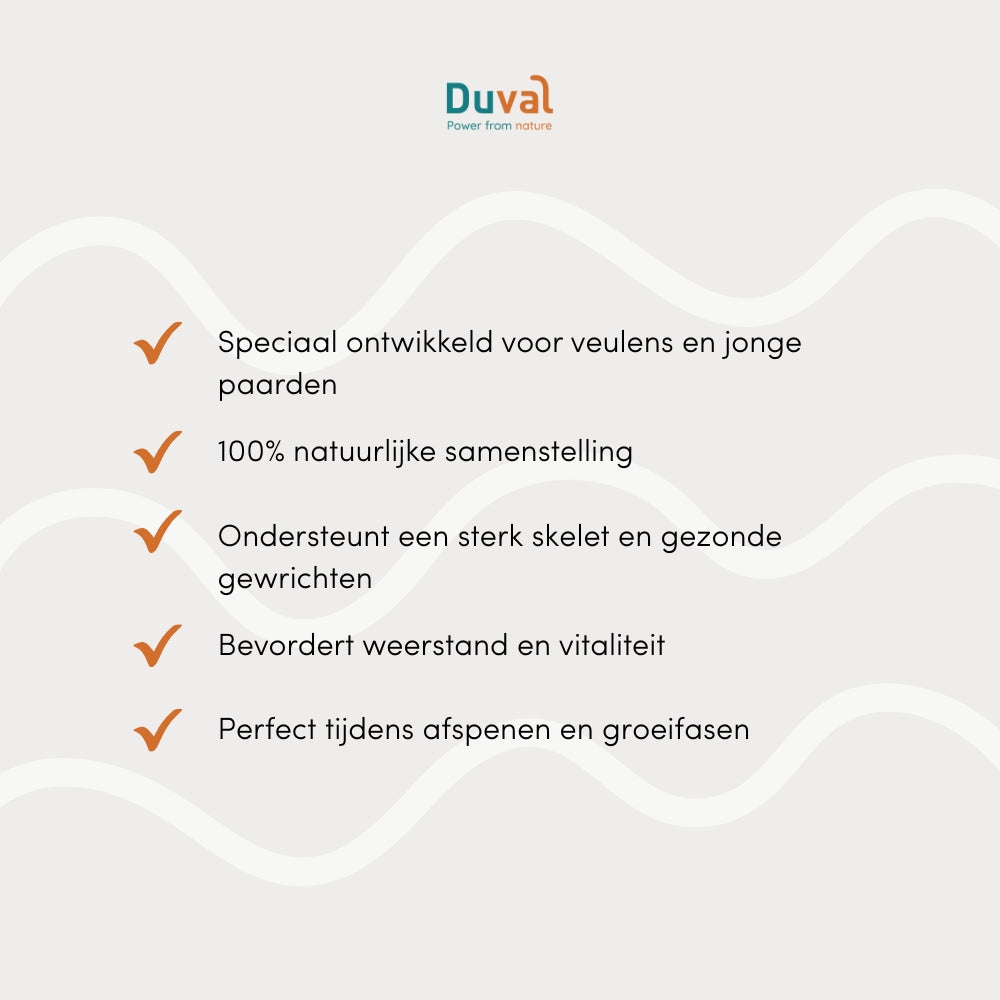 Duval VitaGrow+ is ontwikkeld voor veulens en jonge paarden die in hun eerste levensjaren een stevige basis nodig hebben voor gezonde groei, sterke botontwikkeling en een veerkrachtig immuunsysteem. In deze fase wordt het fundament gelegd voor een krachtig bewegingsapparaat, een stabiele stofwisseling en een optimale opname van voedingsstoffen.