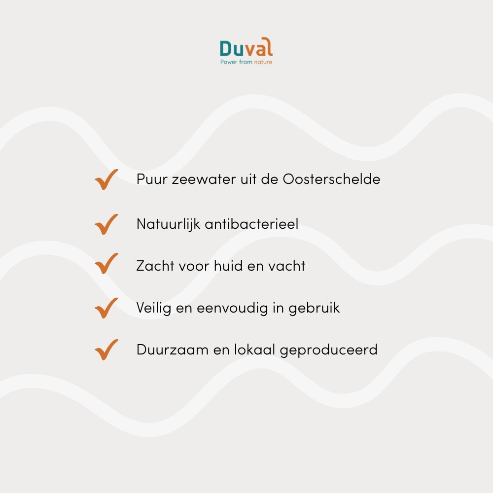 Bij wonden draagt het gebruik van gezuiverd zeewater bij aan een schone, goed verzorgde huid die ruimte krijgt om te herstellen. Daarnaast kan Duval Oosterschelde Water inwendig worden ingezet als elektrolytenaanvulling, vooral bij paarden die veel zweten door warm weer of inspanning.