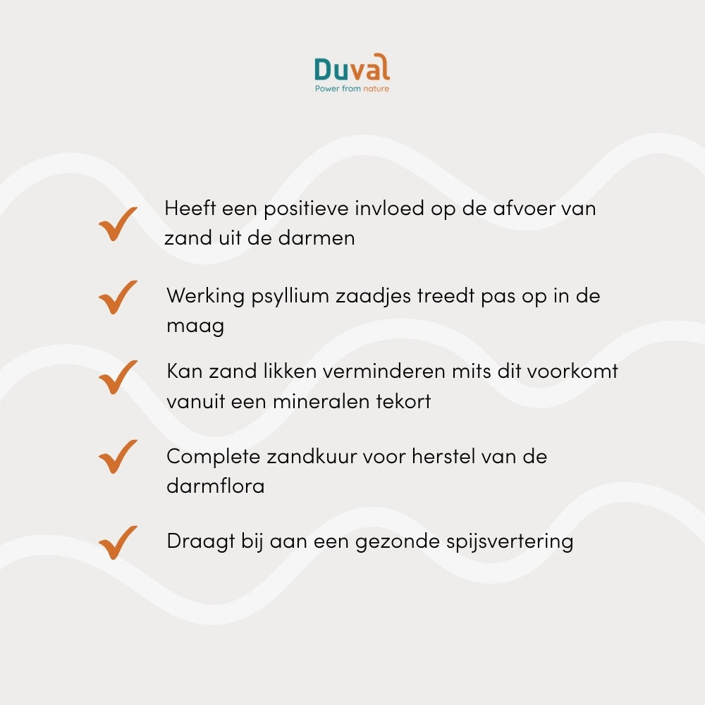 • Psylliumzaad - Psyllium bindt veel water en vormt een gelachtige substantie die de darmbewegingen ondersteunt. Hierdoor kan zand makkelijker door het spijsverteringskanaal worden meegevoerd.
