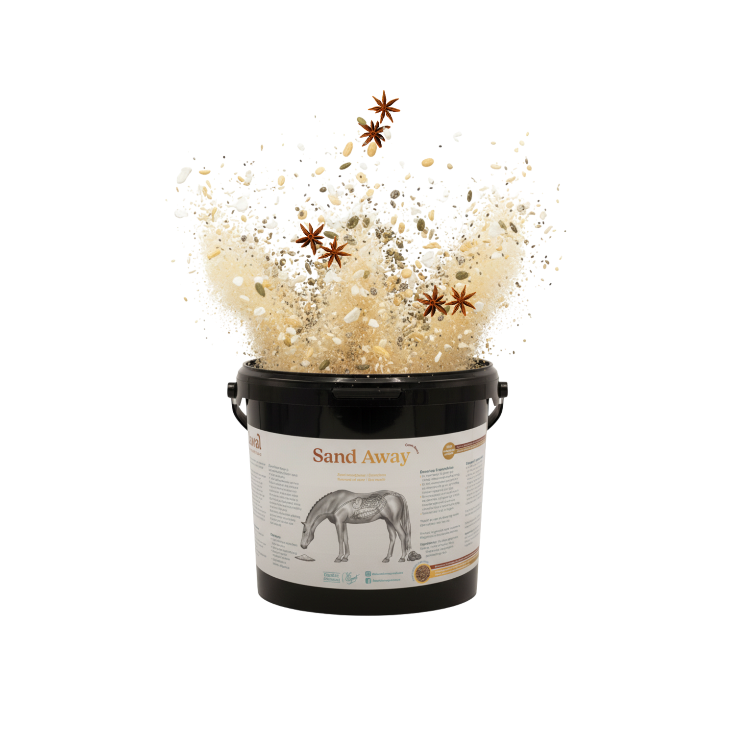Sand Away is ontwikkeld voor paarden die risico lopen op zandophoping, regelmatig zand likken, of waarbij mestonderzoek zandresten laat zien. Door het sterke waterbindend vermogen van psyllium en de aanvullende werking van de andere ingrediënten, vormt Sand Away een natuurlijke gel die zand meeneemt naar buiten en bijdraagt aan een gezonde spijsvertering.