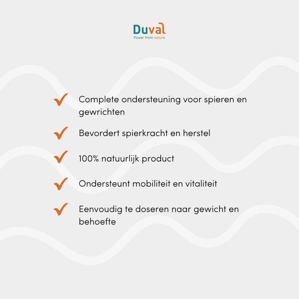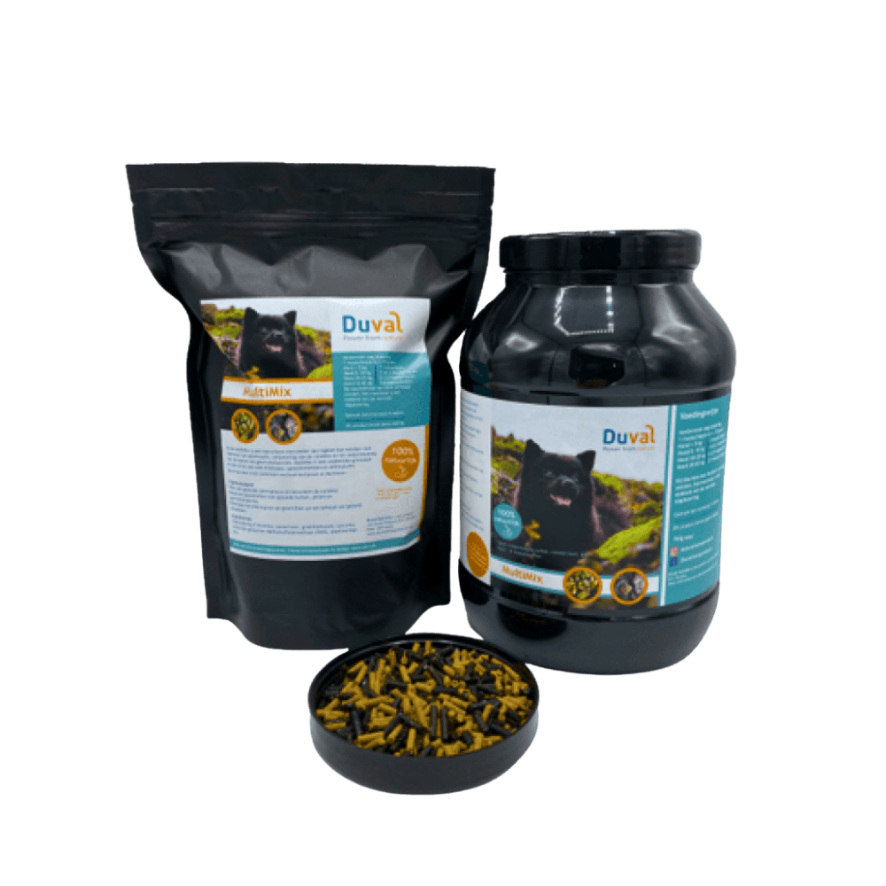 Duval MultiMix is ​​produced using only natural, high-quality ingredients that meet the daily needs of dogs. The combination of proteins, amino acids, minerals, and trace elements is carefully balanced to provide targeted support to the musculoskeletal system. All ingredients are selected for purity, origin, and absorbability, ensuring the body can utilize them effectively. MultiMix containsnopreservatives,noNo artificial flavors, colors, or fragrances, and is a pure supplement to regular food. The result is a reliable product that visibly contributes to muscle strength, mobility, and overall health.